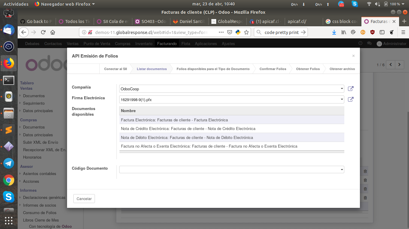 6.4.- Seleccionar Código de Documento disponible según diario de venta y listado autorizados en el SII